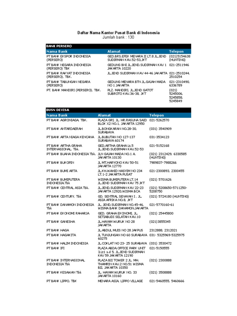 Daftar Nama Kantor Pusat Bank di Indonesia